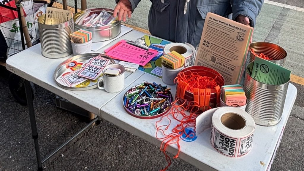 As part of local whistle-distribution efforts, community members hand out flyers explaining how drawing a crowd to observe and document immigration enforcement efforts can help to check their worst excesses.